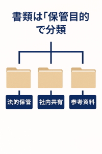 「法的保管」「社内共有」「参考資料」など、保管理由を明確にして分類します。